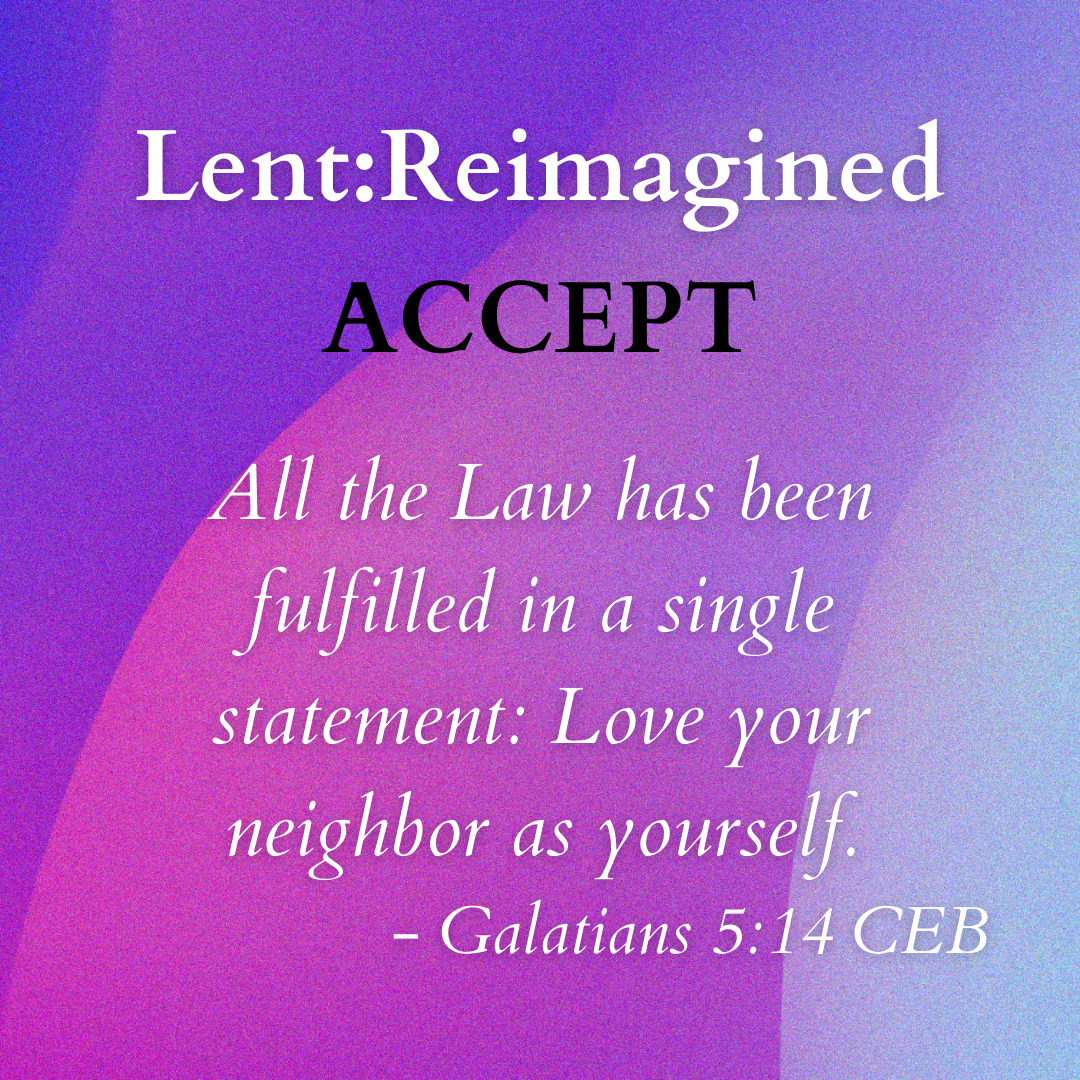 Slide 1 Slide 1 (current slide) Accept March 27-April 2, 2022 Do you accept the freedom and power God gives you to resist evil, injustice, and oppression in whatever forms they present themselves? Scripture Text: Galatians 5:13-14 CEB Read Here Word from the World More Here Receive our daily (Monday - Friday) questions related to each week's theme:Follow our stories on Facebook, and/or Instagram.Join the Text Community. Text LENT to +1 (904) 853-3770.